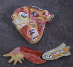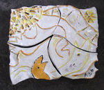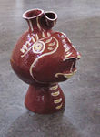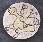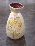 1998Vaas van rode klei, voorzien van witte engobe, getekend in de natte klei vandaar de rode lijnen, ingekleurd met gele engoben en uiteindelijk geglazuurd getekend .Beetje zwwar eerste werkstuk!!!!